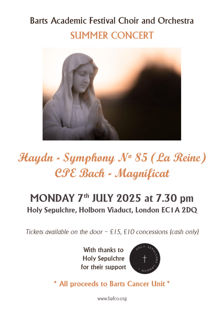 Do join us for a musical evening at Holy Sepulchre on Monday 9th July. All ticket proceeds are donated to Barts Cancer Unit towards that something extra for patients and staff.