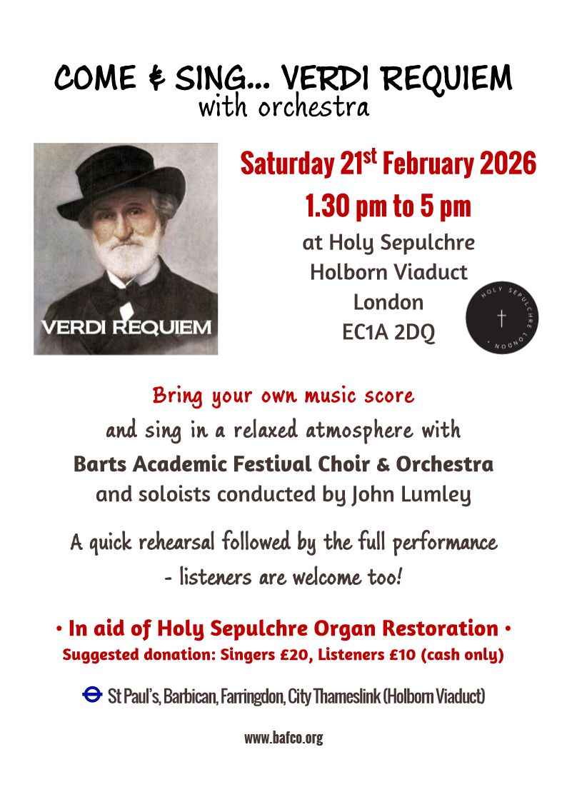 With the arrival of January, choir rehearsals begin again on Friday 9th at 7 pm in Barts-the-Less Church. This term, we’ll be looking at Wagner’s Parsifal for the Opera Days (one each term) and revisiting well-known pieces like Verdi’s Requiem for the Come & Sing in February, as well as Puccini’s Messa di Gloria for our Easter Concert.